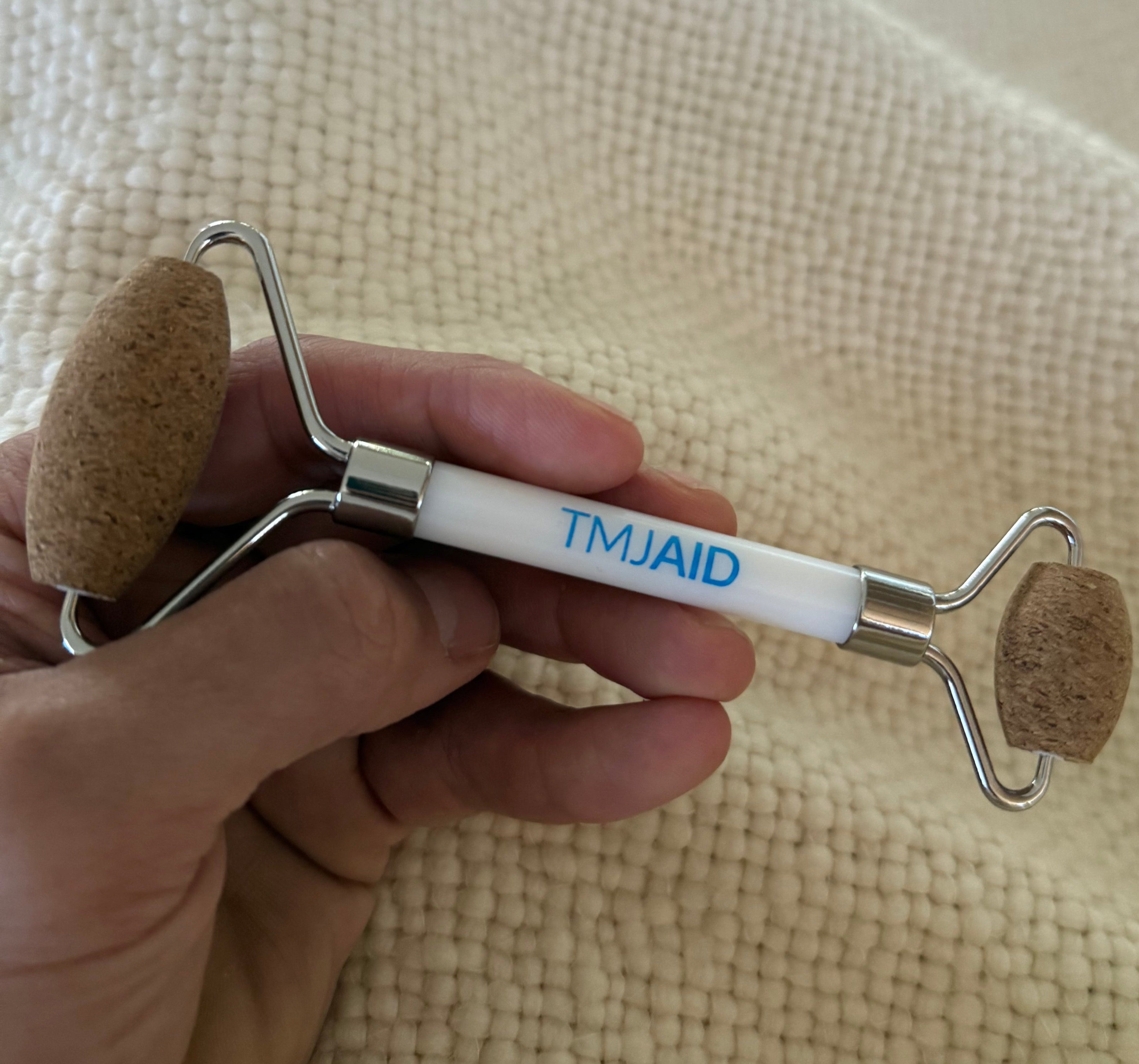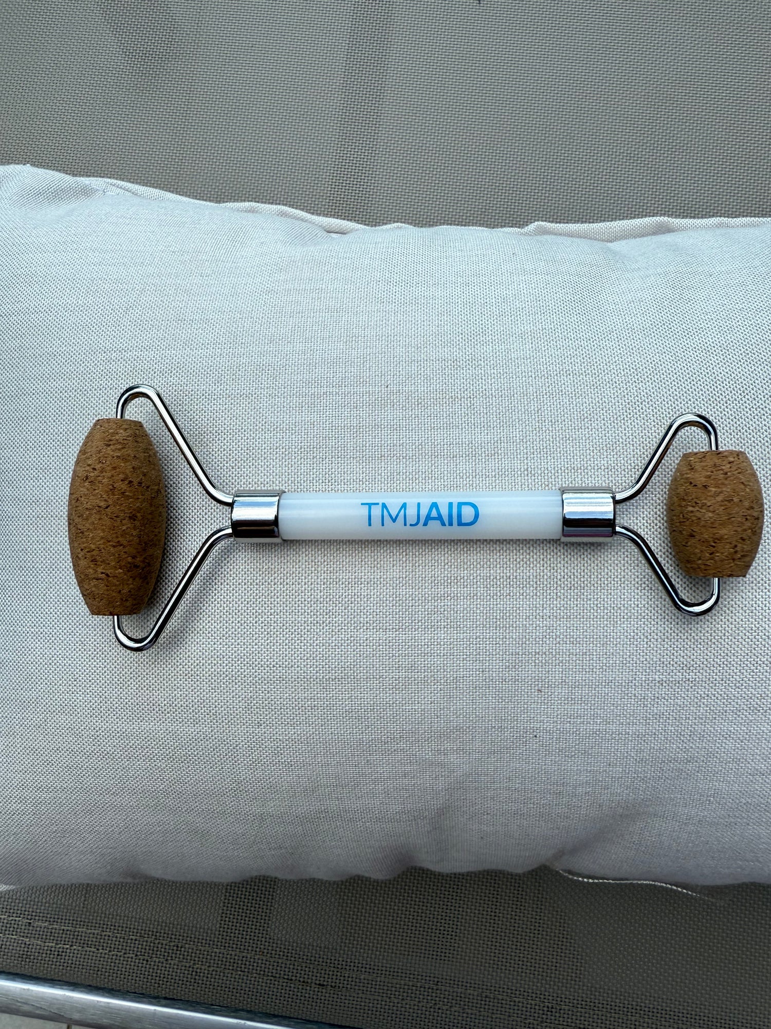 I suffered for years with jaw muscle pain due to clenching and grinding my teeth during sleep. During my treatment visit with my TMJ doctor, I would often mention that I would spend my day massaging my jaw muscles for relief. It was suggested that a sustained hand rolling technique with a cork would be more beneficial and hygenic. After realizing the benefit of the soft cork massaging my jaw, it did not take long to create the TMJaid roller.