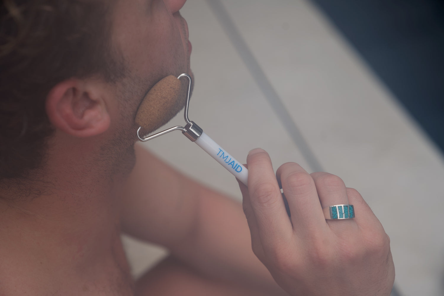 Start by finding the most tender areas in your masseter and temporalis muscles. Then if you bring your teeth together you will likely feel a bulge. The most tender and developed areas are where you want to focus the rolling and leaning of the TMJAID.